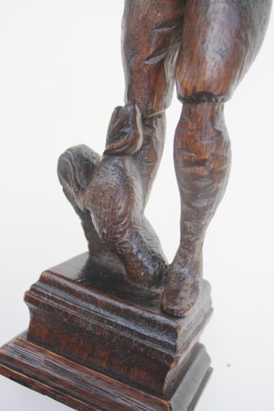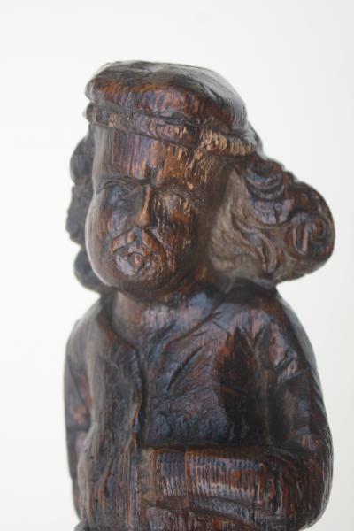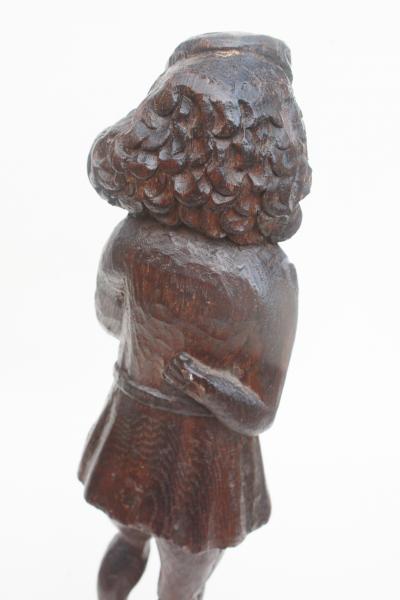 A very rare early 17th century carved oak figure of a gentleman. Although dressed in the costume of the period it represents Saint Roch and his dog, seen at his foot either licking his wounds or feeding him with a biscuit.
