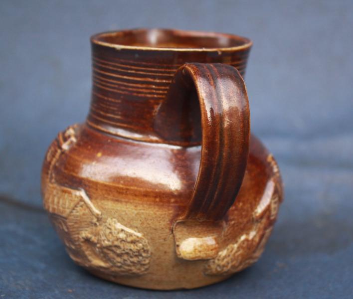 Can a brown saltglaze jug be romantic, I love the combination of a basket of flowers, representing romance leading to the church and a cottage on this small, London Kishere jug of circa 1820.