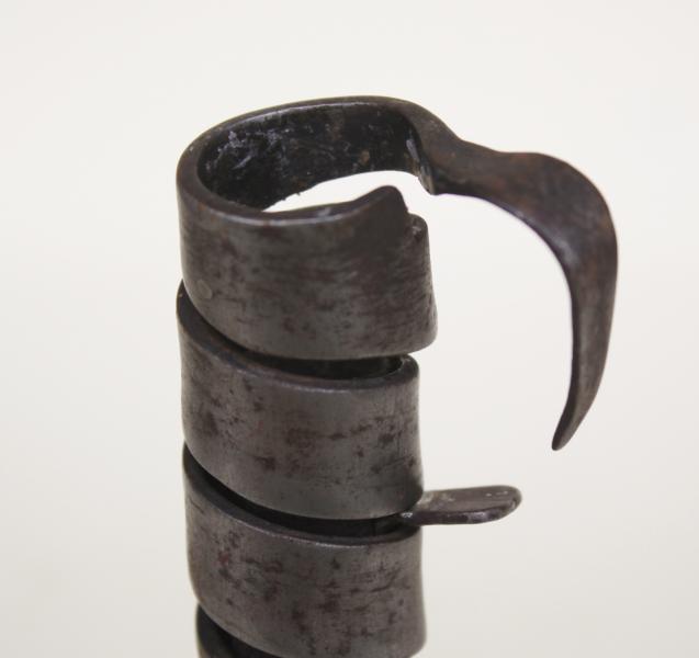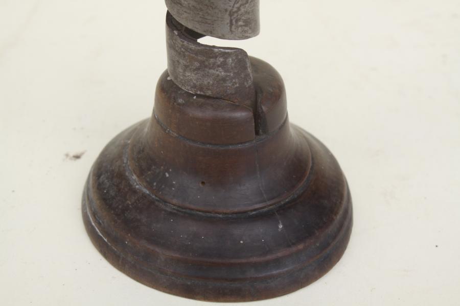 Although many of the books on early lighting have these as English and 18th century, most are in fact French. They were made from the mid 18th century and well into the 19th by the local blacksmith. The wrought iron worked into a spiral in-which they place a raiser that can be worked up as the candle burns down. The base of turned wood. In France they are called Rat Tailed candlesticks, and in the USA they are known as Courting candlesticks, the father of a young woman placing the raiser up to a position, when the candle burns down it is time for the suitor to leave.