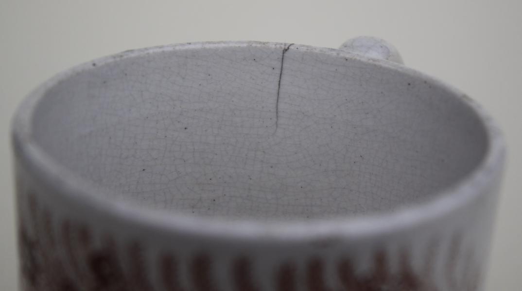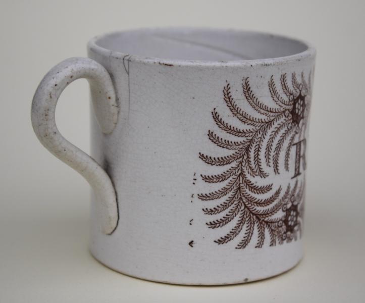 A very uncommon name on early children's ware. Transfer printed in brown with a fern / feather border.