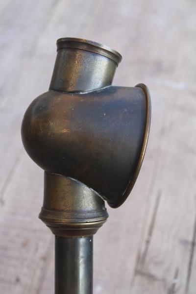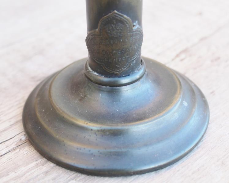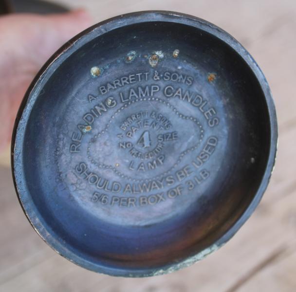 This wonderful A Barrett & Sons Patent No 4 reading lamp from the late 19th century (the top an be turned for straight or dipped light) has on the bottom an advert " Reading Lamp candles Should Always be used 5/6 per box of 3LB..