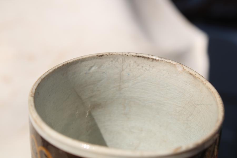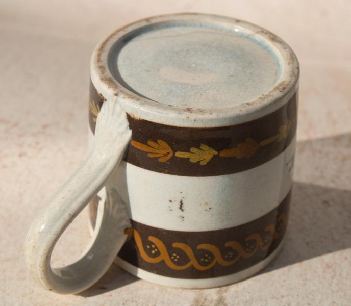A wonderful early childs mug decorated with two bands of brown slip decorated in Pratt colours and the inscription A GIFT FOR PETER.