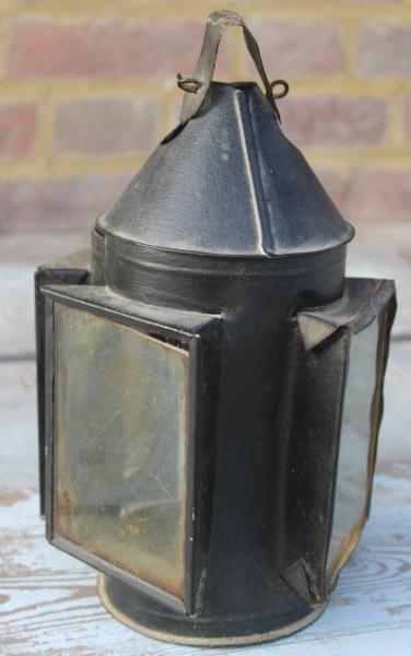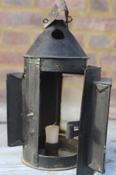 This late 19th century sheet iron/ tin candle lantern is in exceptional original condition. Retains its original 3 panel glass windows.