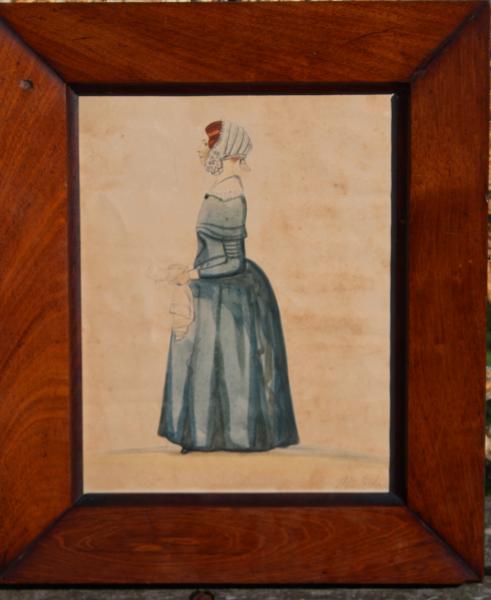 A classic early 19th century portrait of a young woman, standing holding a letter and hankie chief over her arm.