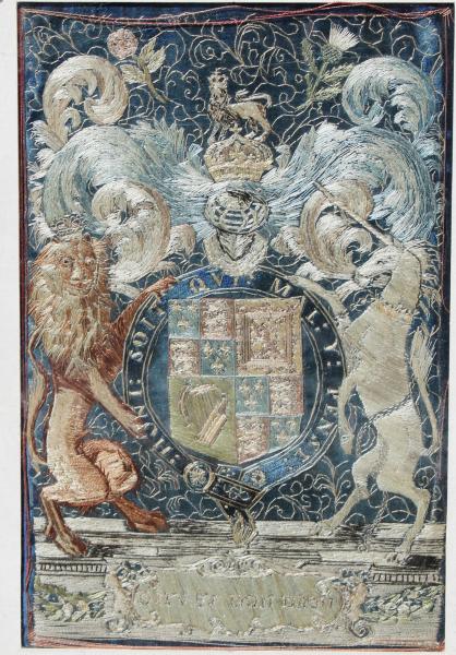 An exceptional piece of mid 17th century needlework. The Royal coat of Arms of Charles II. Taken from an engraving by Wenceslaus Hollands Royal Arms which face Thomas Loggan's frontpiece to the Prayer Book of 1662, although used earlier in Cambridge in 1661.