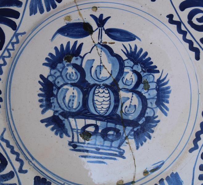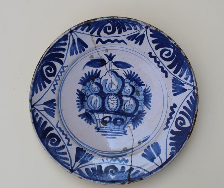 A wonderful mid 17th century Dutch Delft charger with bold design of a basket of fruit.