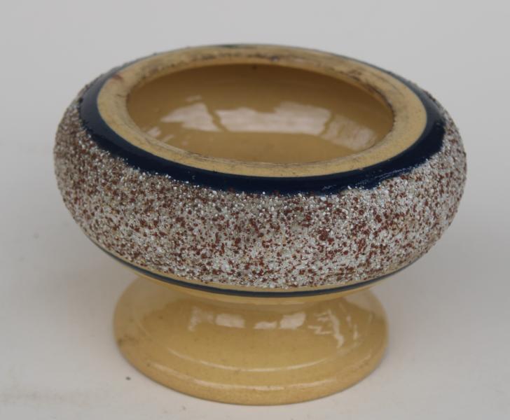 A very unusual form, a large Yellow ware master salt or with the external grog surface this may have been intended as a match striker .