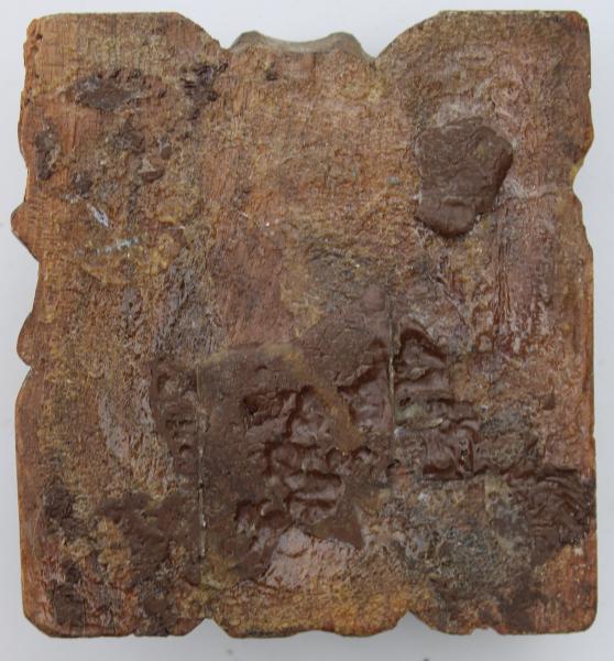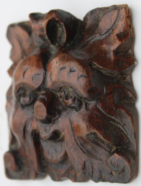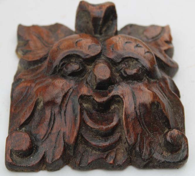 A delightful small carved oak boss in walnut depicting the face of a green man. His mouth tong and eyes appearing through the leaves that form the face and head.