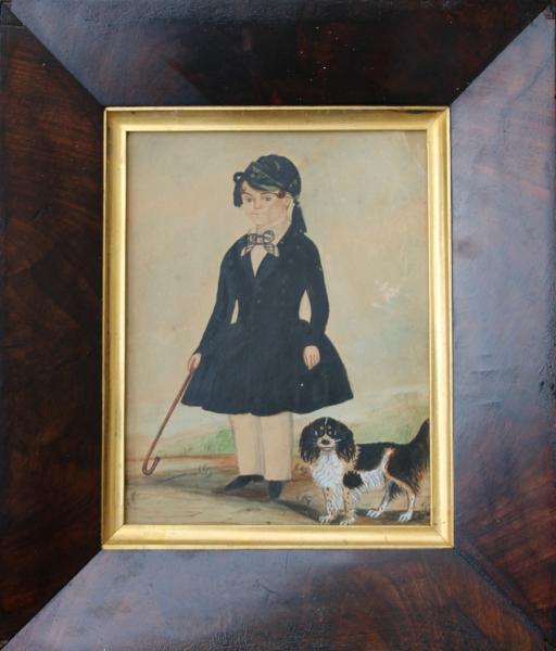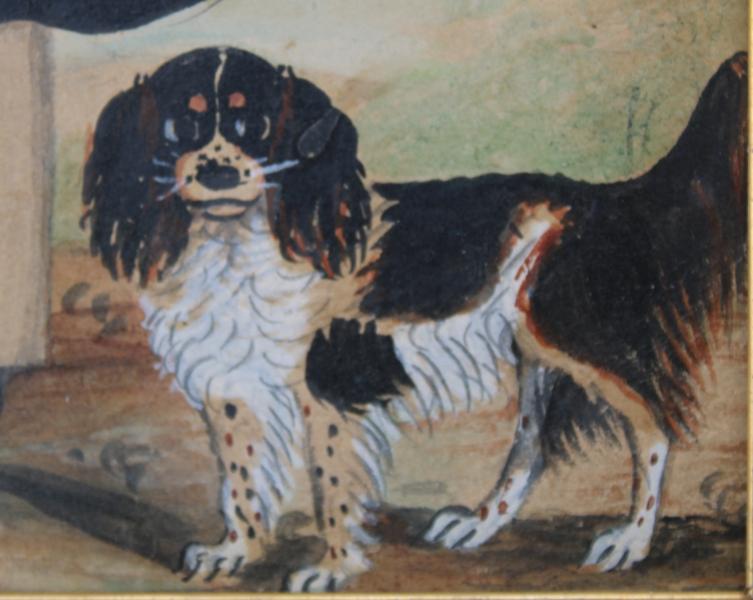 A charming early 19th century water colour depicting a young boy, taking his pet spaniel for a walk.