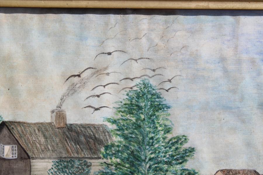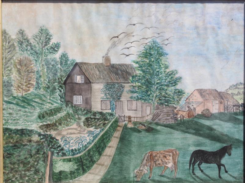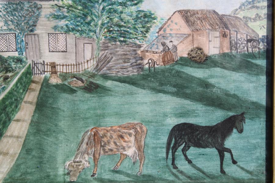 Wonderful naïve water colour of a farmhouse with out buildings including a small pole barn. in front a vegetable garden and field with cow and black horse.