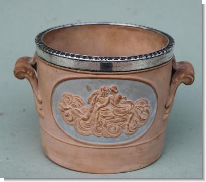 The "old Sheffield plate" rim , by Robert Gainsford ( his mark clearly placed central above the classical vignette) an integral part of the design protecting the pot from chipping against the harder wine decanter.