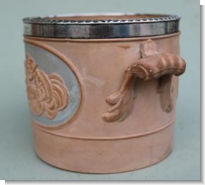 Made at a time when pottery formed an integral part of an interior. The Adam style had moved away from the strict mathematical proportions previously found in Georgian rooms, and introduced curved walls and domes, decorated with elaborate plasterwork and striking mixed colour schemes using newly affordable paints in pea green, lemon, lilac, sky blue, and red-brown terracotta as in this wine coaster.
