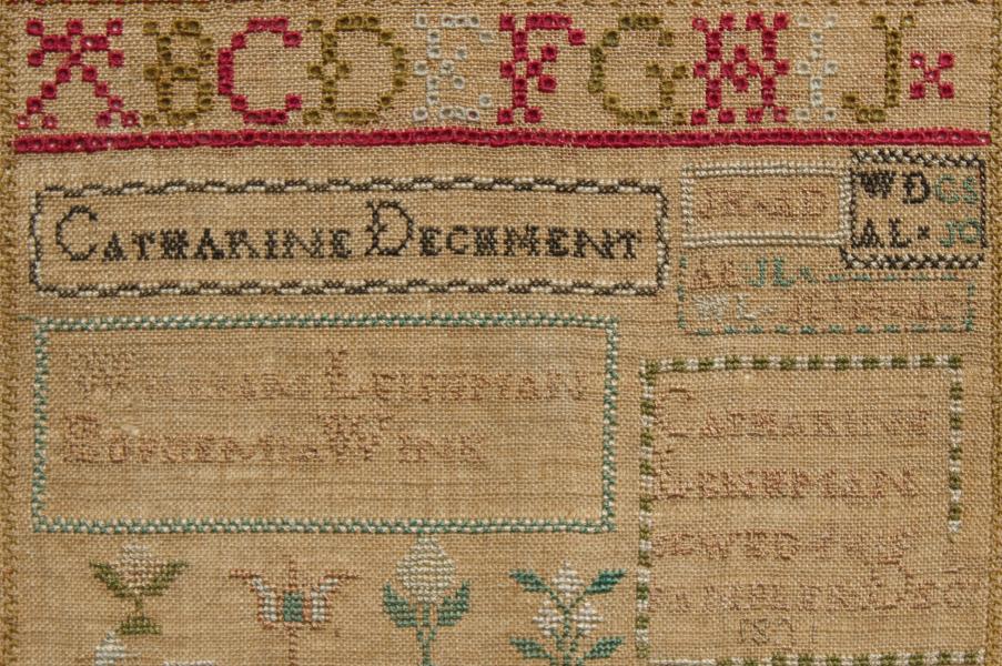 Catherine Leishman sewed this sampler Dec.1831. She highlights her mothers name Catherine Dechmont in black letting us know she had died, and her fathers details William & her stepmothers name Euphemia Wink .(both having three children).