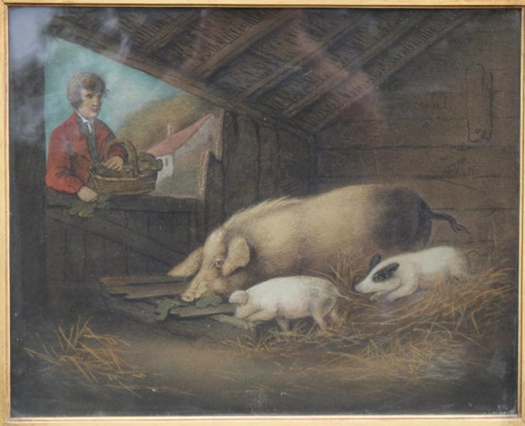 This large example of three pigs in a sty with the farm boy looking on is signed middle top right and retains its original gilt frame measuring 74 x 64 cm. |