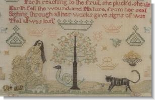 A beautiful and delightful early 19th century silk sampler depicting the story of Eve taking the apple in the garden of Eden. Or at least the garden as she saw it with her large pet cat (or Tiger) small lamb and a pair of pet rabbits.