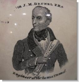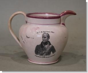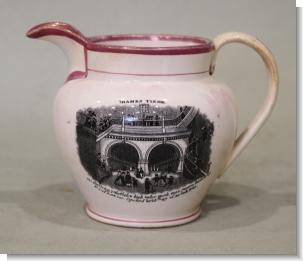 A pearlware Thames Tunnel Brunel commemorative jug with pink luster, circa 1843, printed in black with a titled view of the tunnel above inscribed facts, to the reverse a titled half length portrait 'Sir J.M. Brunel F.R.S., Engineer of the Thames Tunnel'.