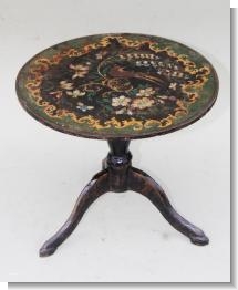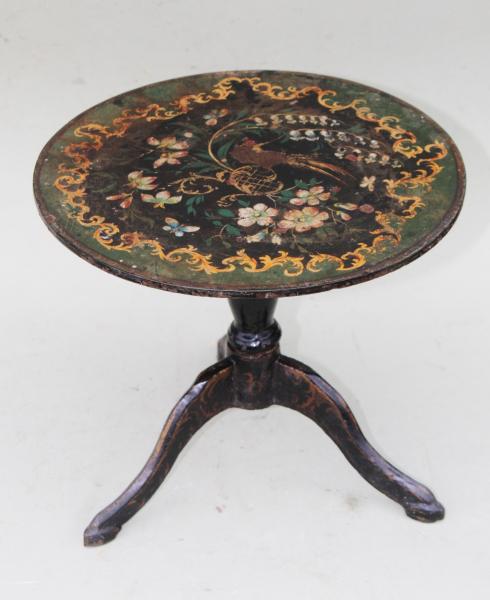 The cabriole tripod table with traditional table catch is of true proportioned . Gilt rococo decoration follows up from the legs to form a gilt border pattern to the painted top. Here a central bird is surrounded by flowers including daisy's and blue bells. The background having a wonderful green tit to it.