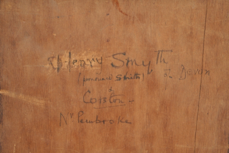 On the back an inscription giving Henry's details as "Henry Smyth (pronounced smith) of Devon; & Corston Nr.Pembroke.